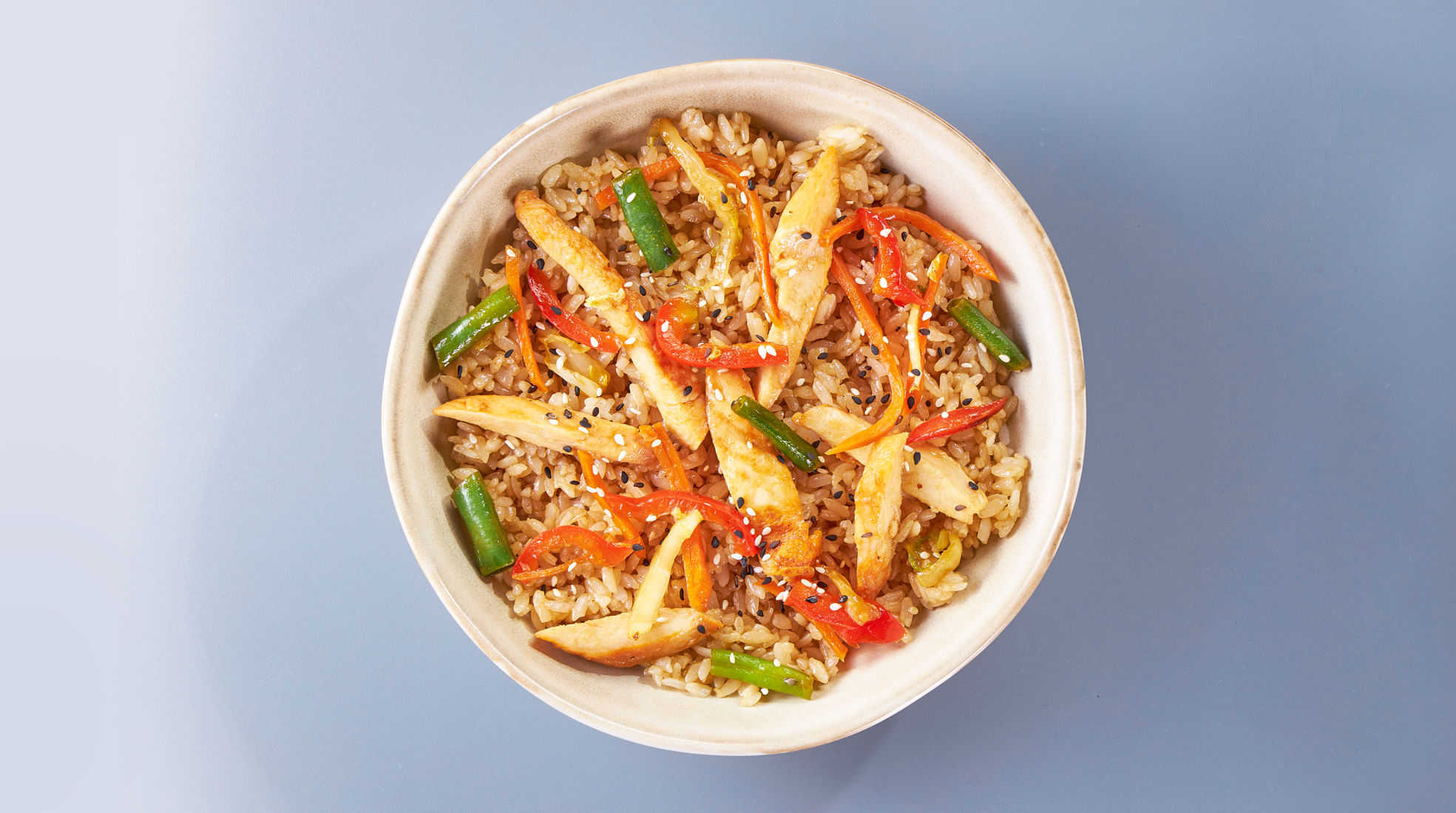 Состав: Курица, рис, соус вок, кунжут, масло подсолнечное, лук репчатый, мокровь, стручковая фасоль, пекинская капуста, болгарский перец. *Внешний вид блюда может отличаться от фото на сайте.