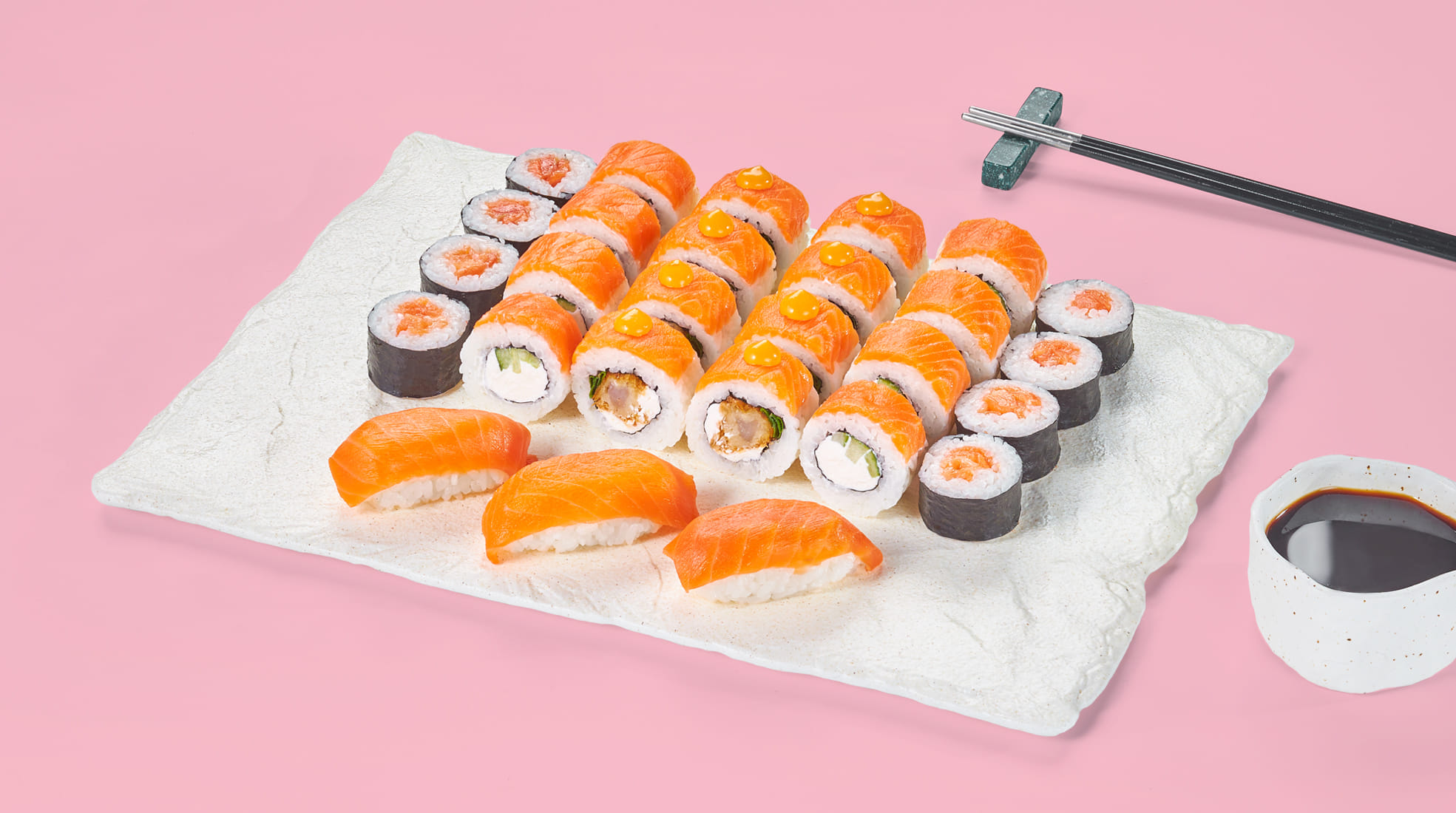 Состав: Ролл Филадельфия лайт с огурцом (8 шт), ролл Момо (8 шт), Сяке маки ролл (мини) (8 шт), Суши с лососем (3 шт) *Не забудьте заказать имбирь, васаби и соевый соус. Они не входят в стоимость заказа. *Внешний вид блюда может отличаться от фото на сайте.