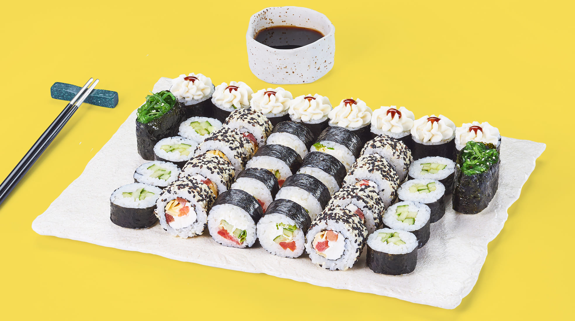 Состав: Ролл Бали (8 шт.), ролл Летний (8 шт.), Каппа маки ролл (мини) (8шт.), ролл Фудзита (мини) (8 шт.), Гункан чука (2 шт.) *Не забудьте заказать имбирь, васаби и соевый соус. Они не входят в стоимость заказа. *Внешний вид блюда может отличаться от фото на сайте.